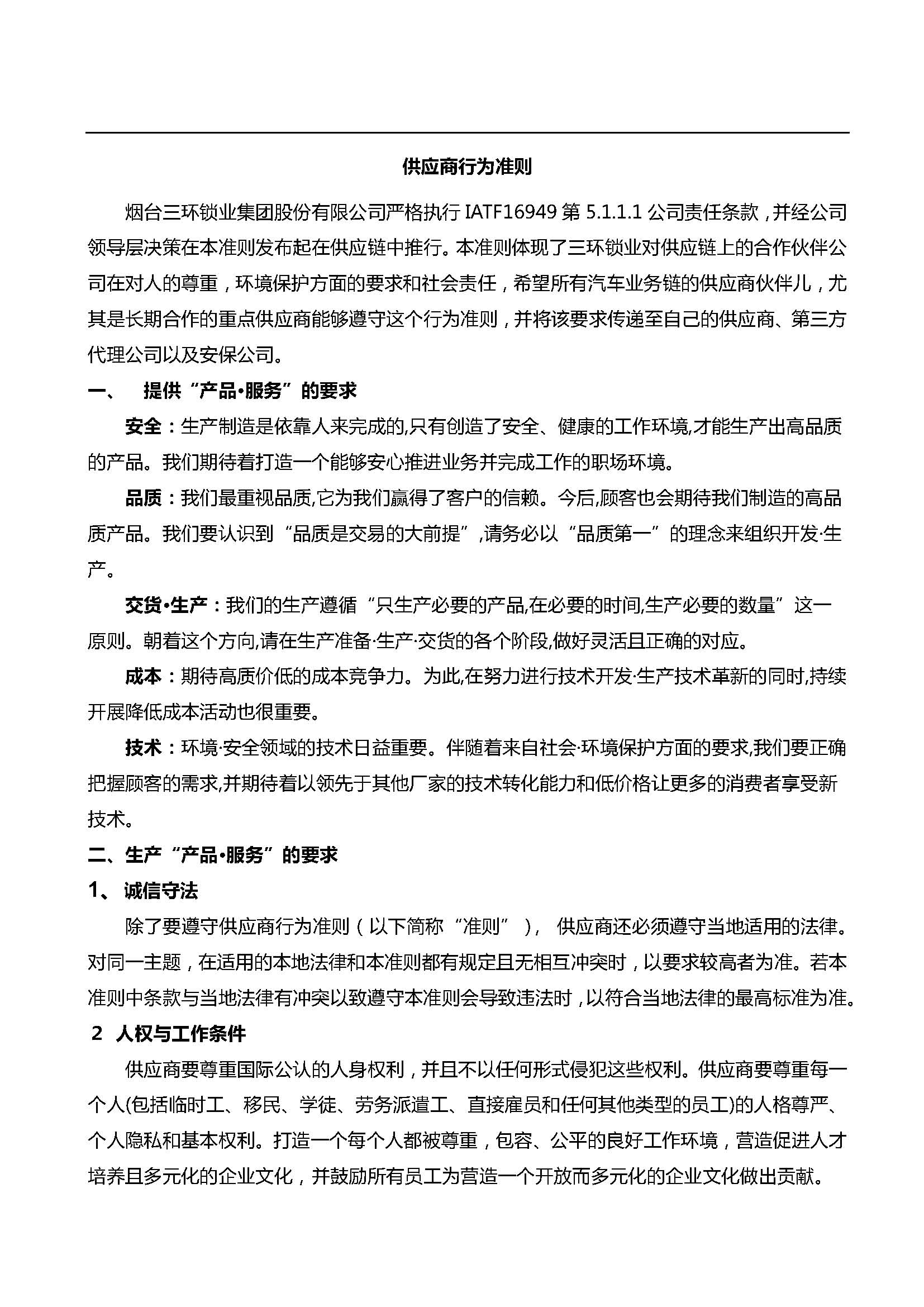 煙臺三環汽車鎖供應商行為準則發布